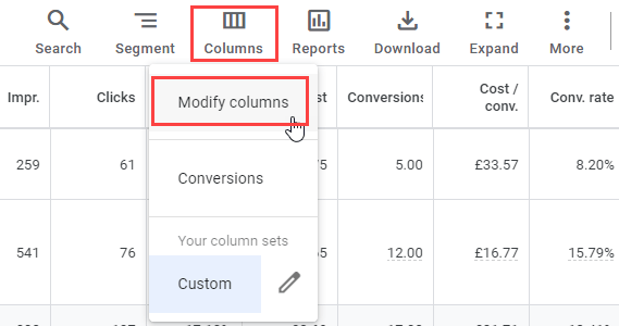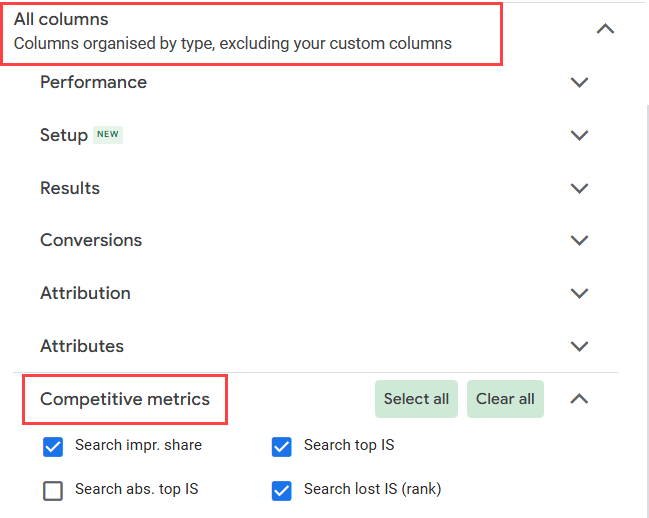 First, if you can’t see any of the competitive metrics in the Google Ads interface, then you’ll need to enable the columns.